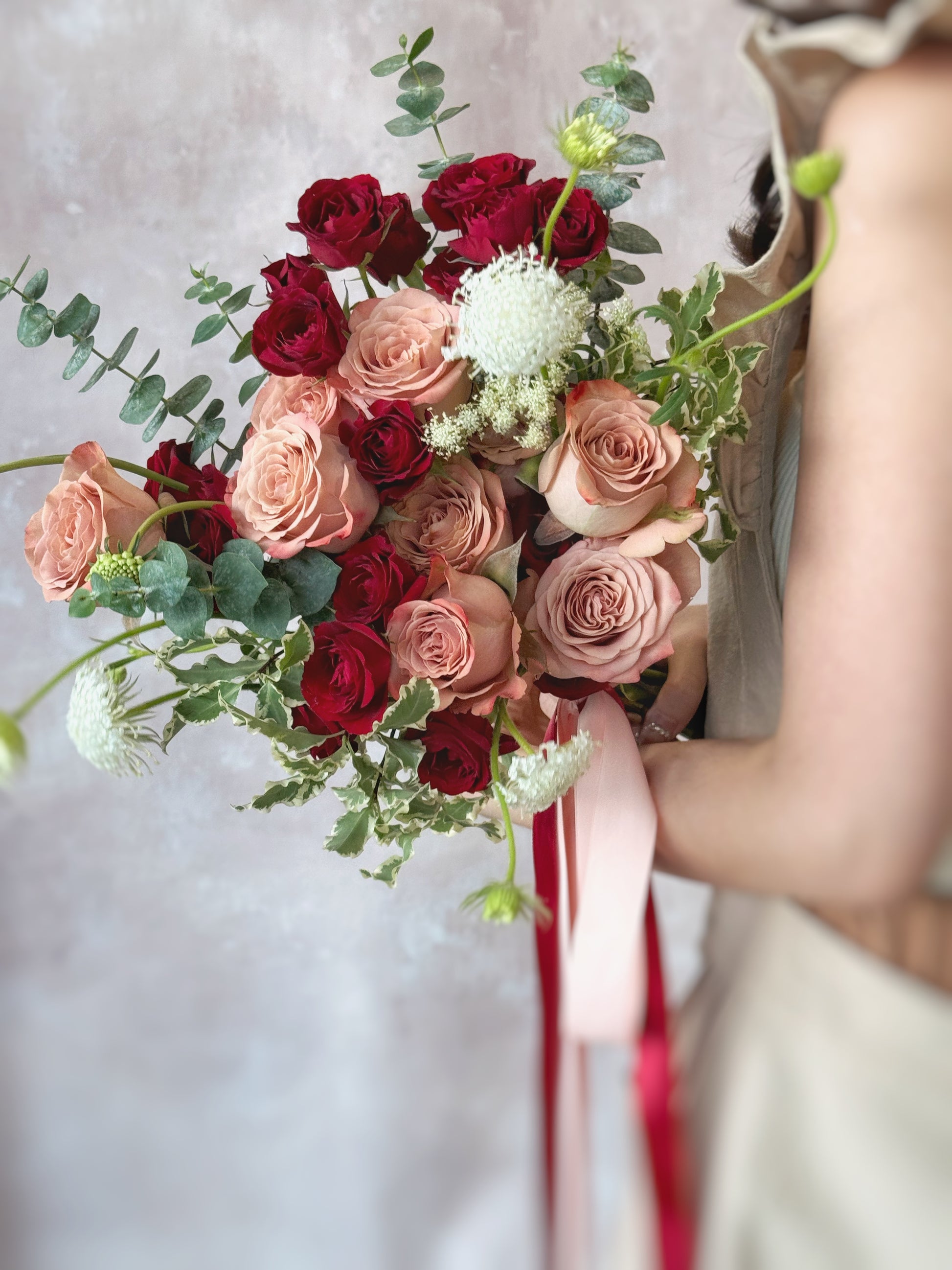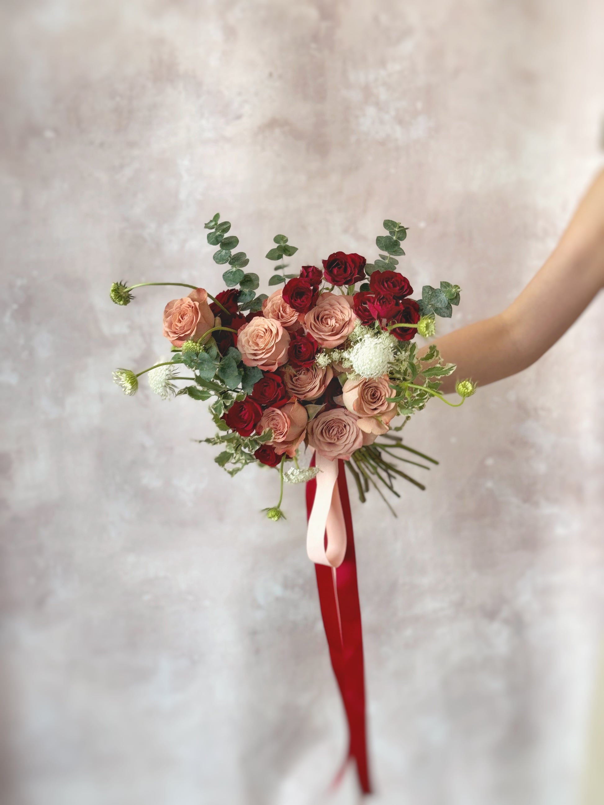 This captivating bouquet features a harmonious blend of red, maroon, and nude pink blooms, highlighted by red spray roses and cappuccino roses.