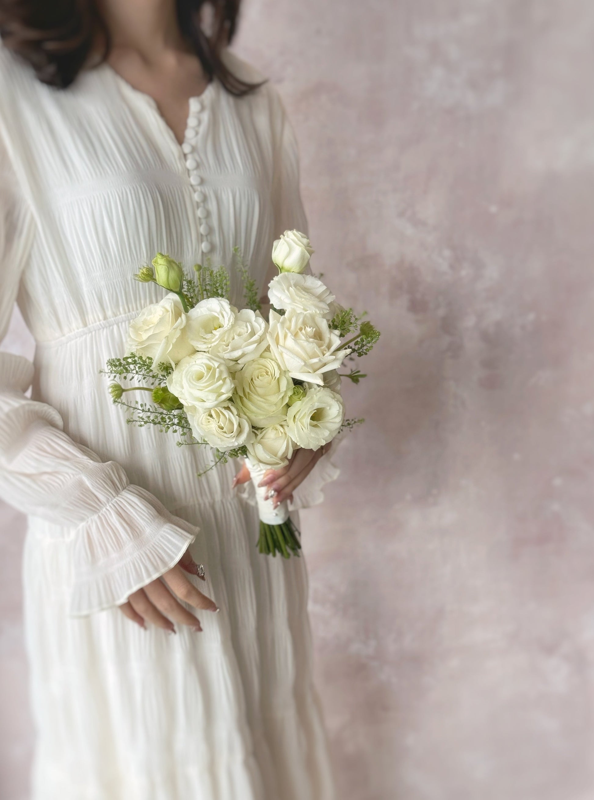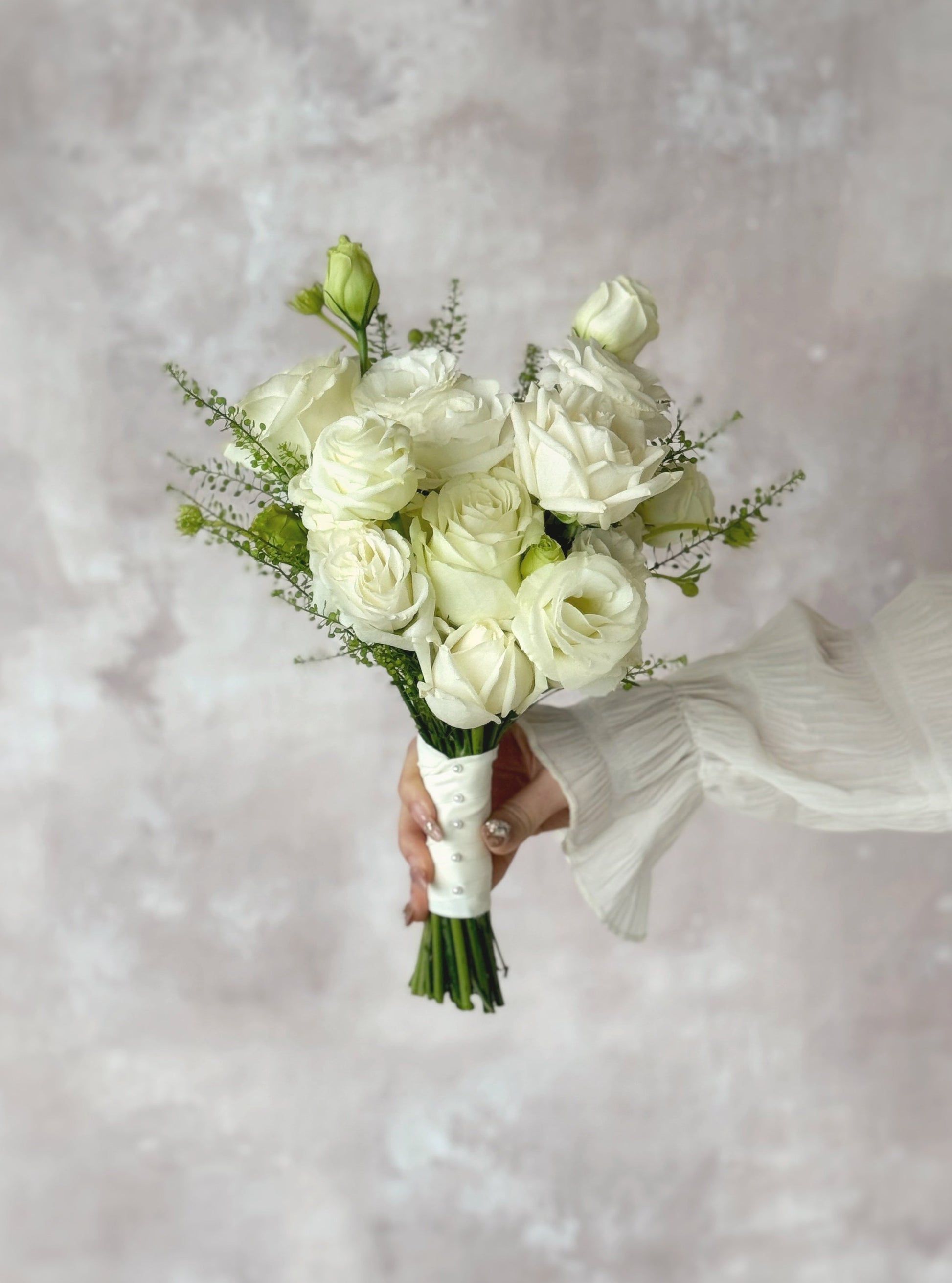 Elegant Korean style bridal bouquet showcasing romantic white flowers (Roses & Eustoma flowers), each possessing its unique charm and beauty!