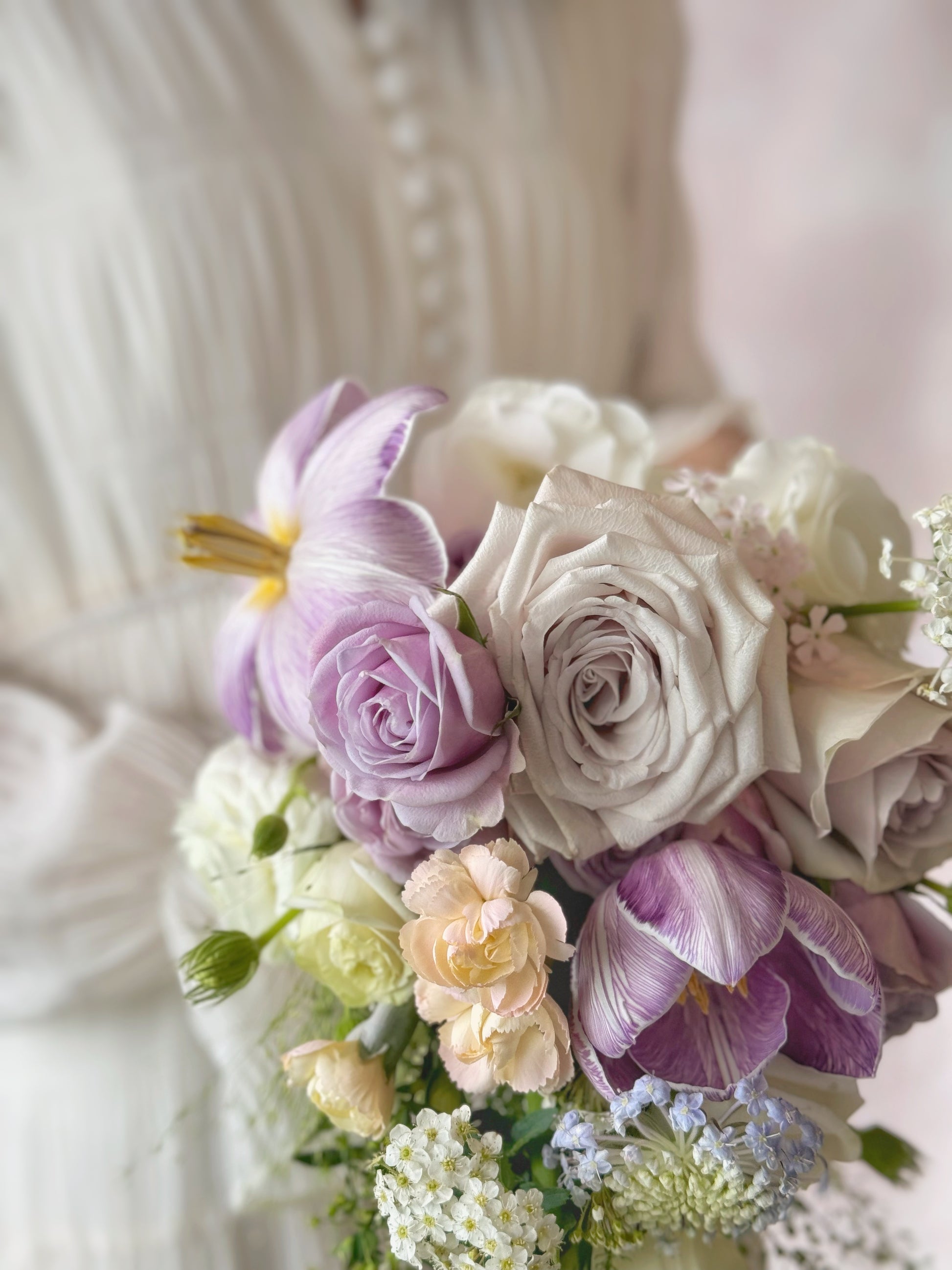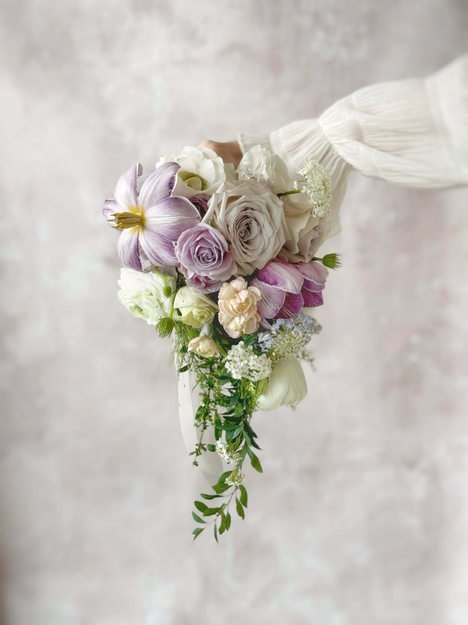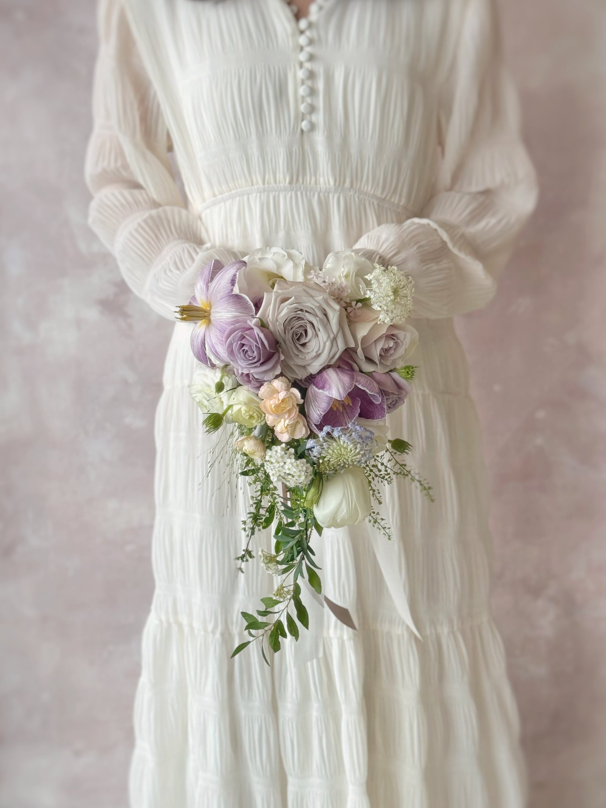 A dreamy blend of lilac and white, Ocean Eyes features cascading Phalaenopsis orchids for an elegant, flowing silhouette. This fresh flower teardrop bouquet exudes grace and romance, perfect for a timeless bridal look.