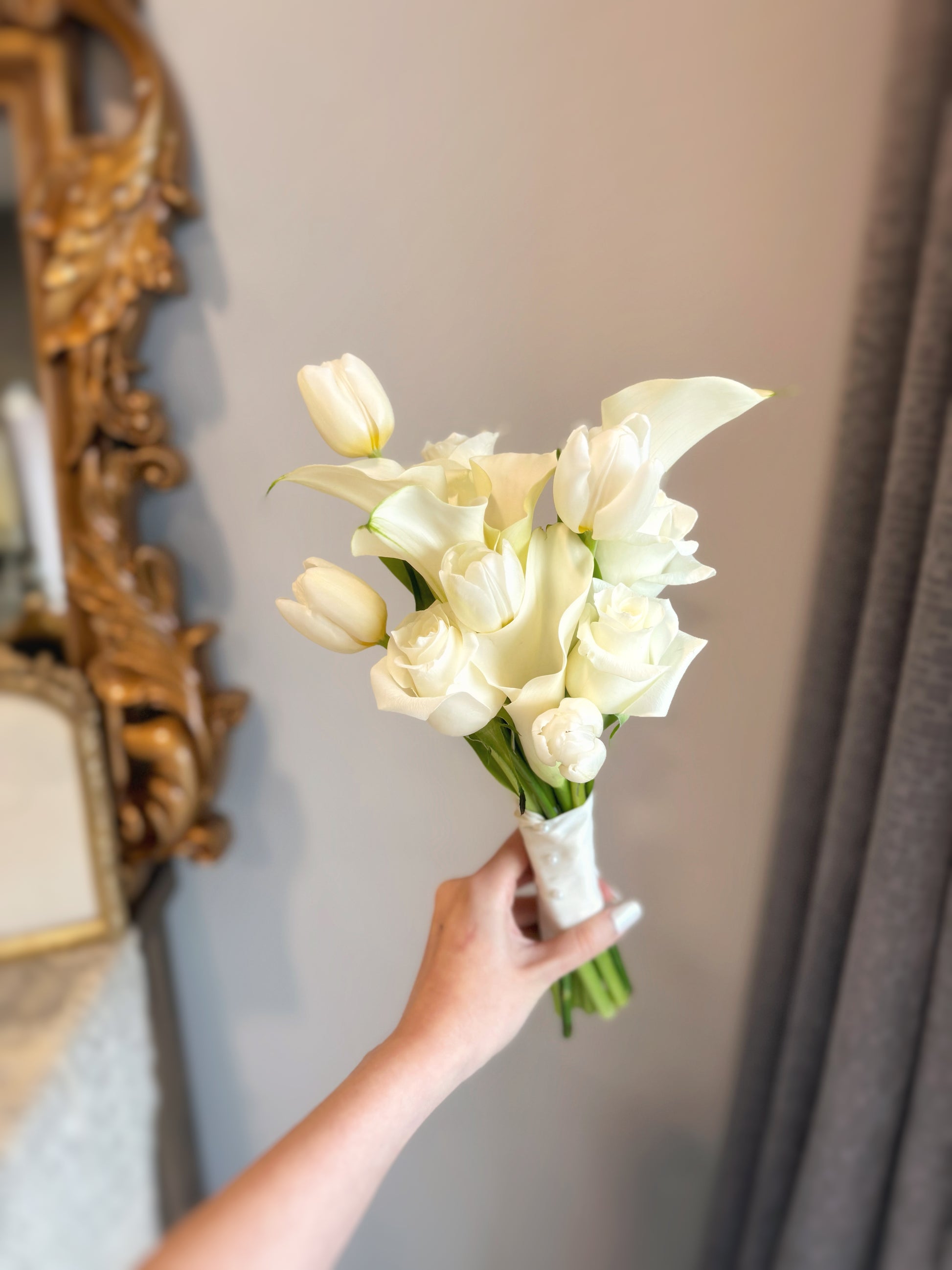 White flowers are just so classic and elegant. This lovely trio of white calla lilies, tulips and roses make a perfect match for a minimalist bridal look!
