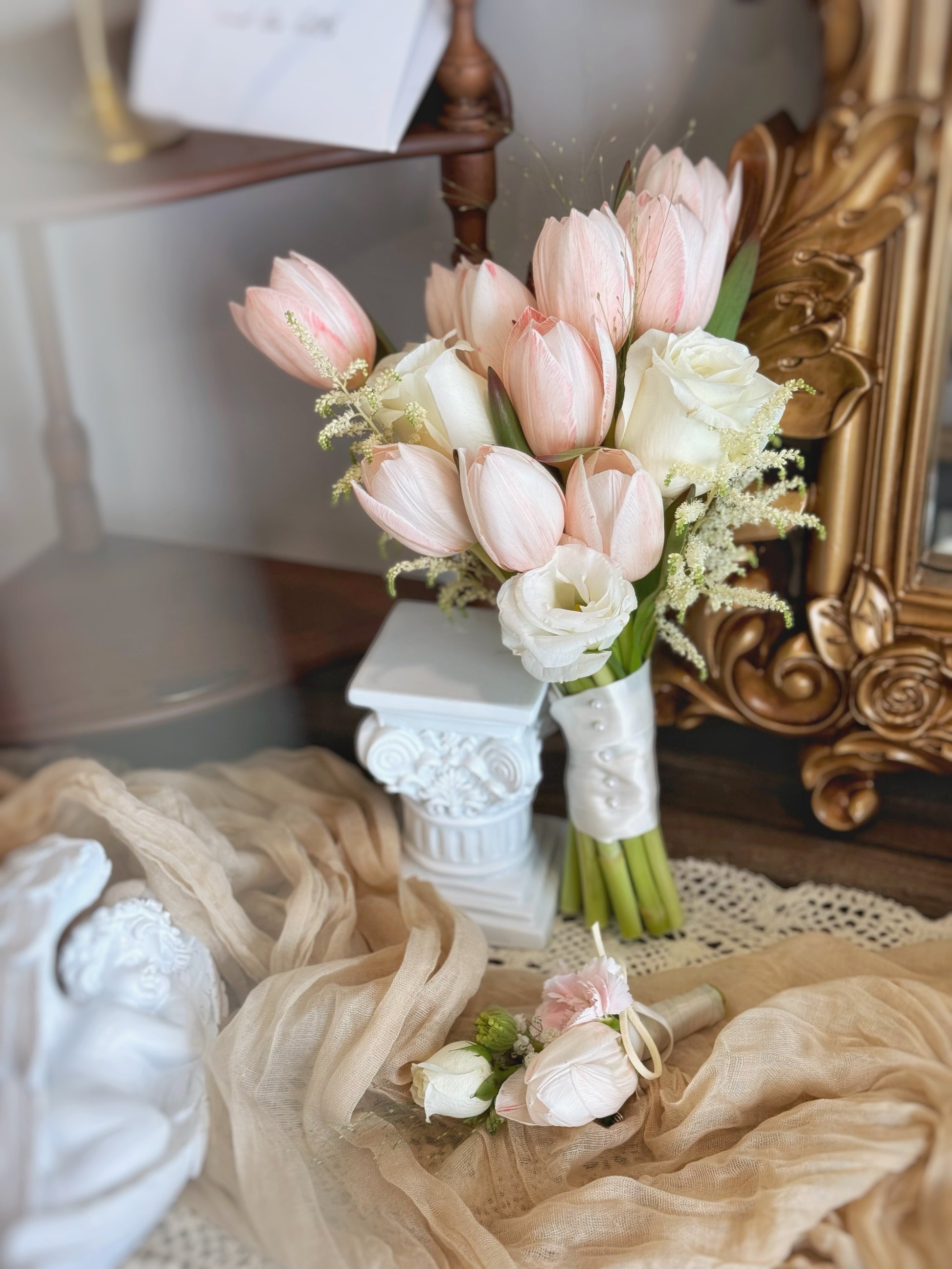 A Korean style bridal bouquet featuring stem dyed peachy toned tulips and white blooms. It is an elegant & simple bouquet design for brides who prefer sleek & clean look.