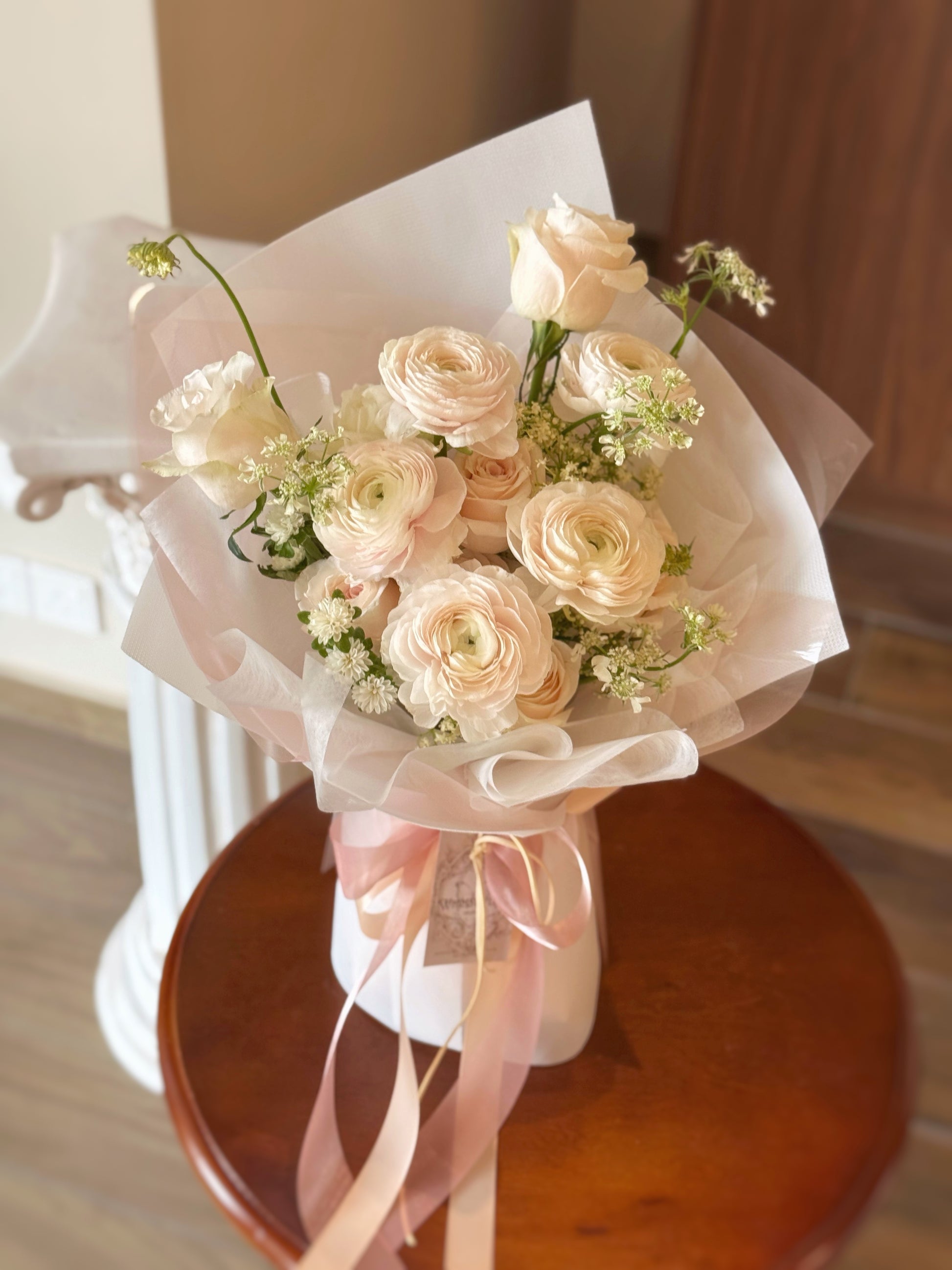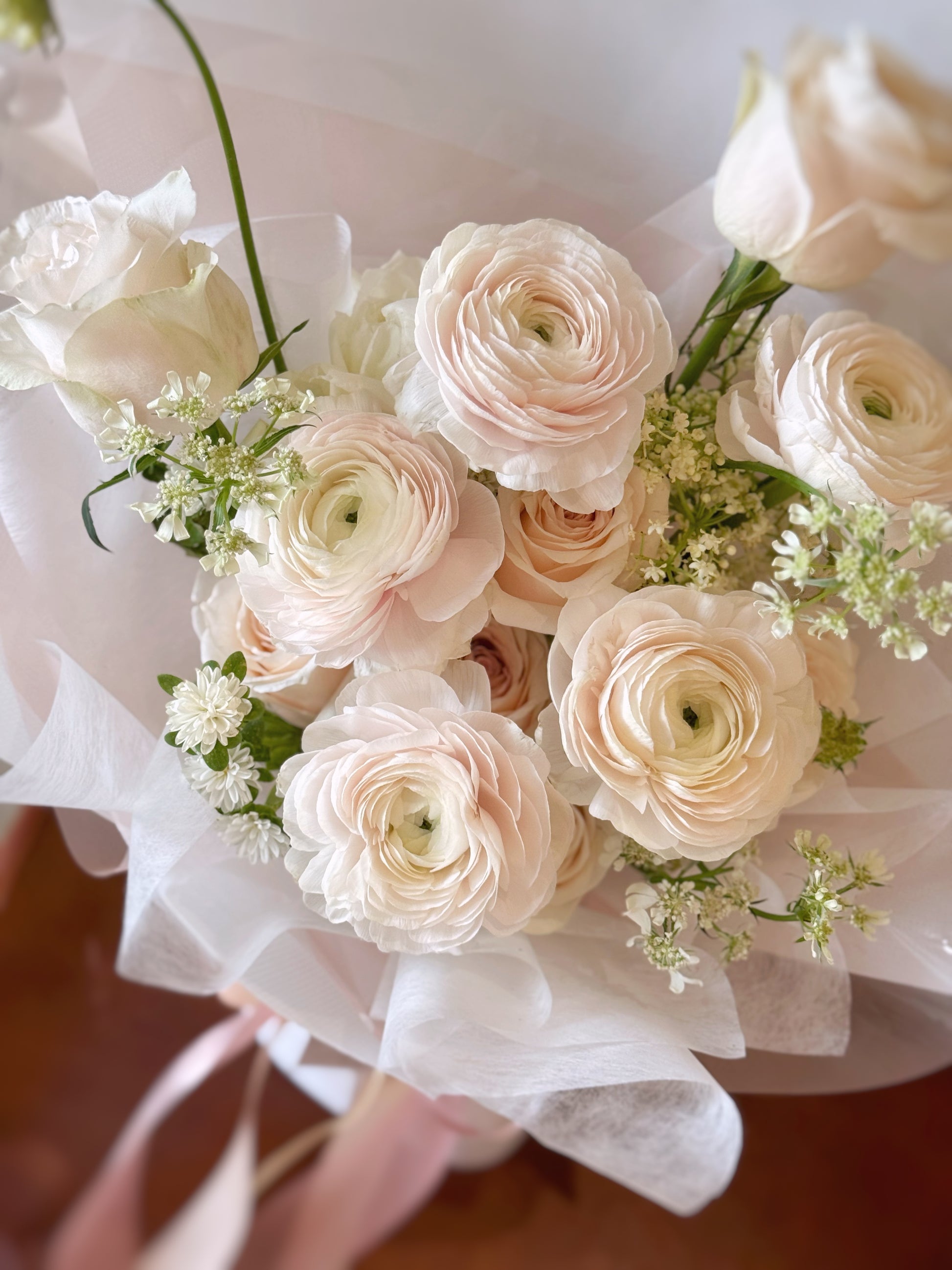 Bouquet's recipe - Ranunculus (cream/white or blush pink), Rose, Lace flower and etc